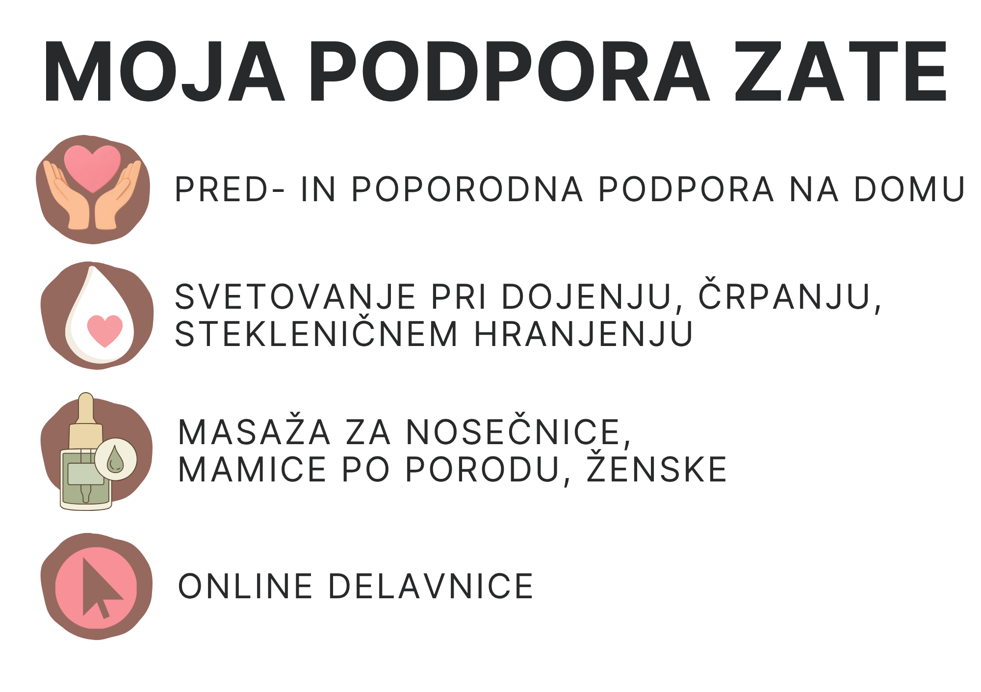 Na obisku nudim tebi in celotni družini celostno podporo med nosečnostjo ALI po porodu: pomoč pri gospodinjskih opravilih, kuhanje in priprava obrokov, svetovanje pri dojenju, osnovah hranjenja po steklenički, razbremenilni svetovalni pogovor, nežna podpora pri ustvarjanju nove družinske rutine, nosečniško in/ali poporodno masažo kadarkoli si jo zaželiš, varstvo starejših otrok,….